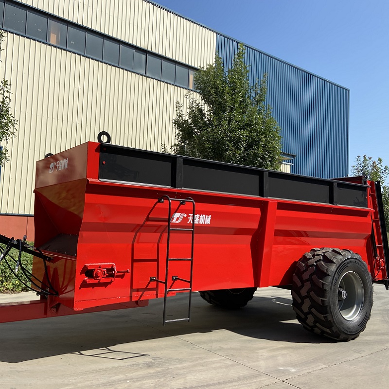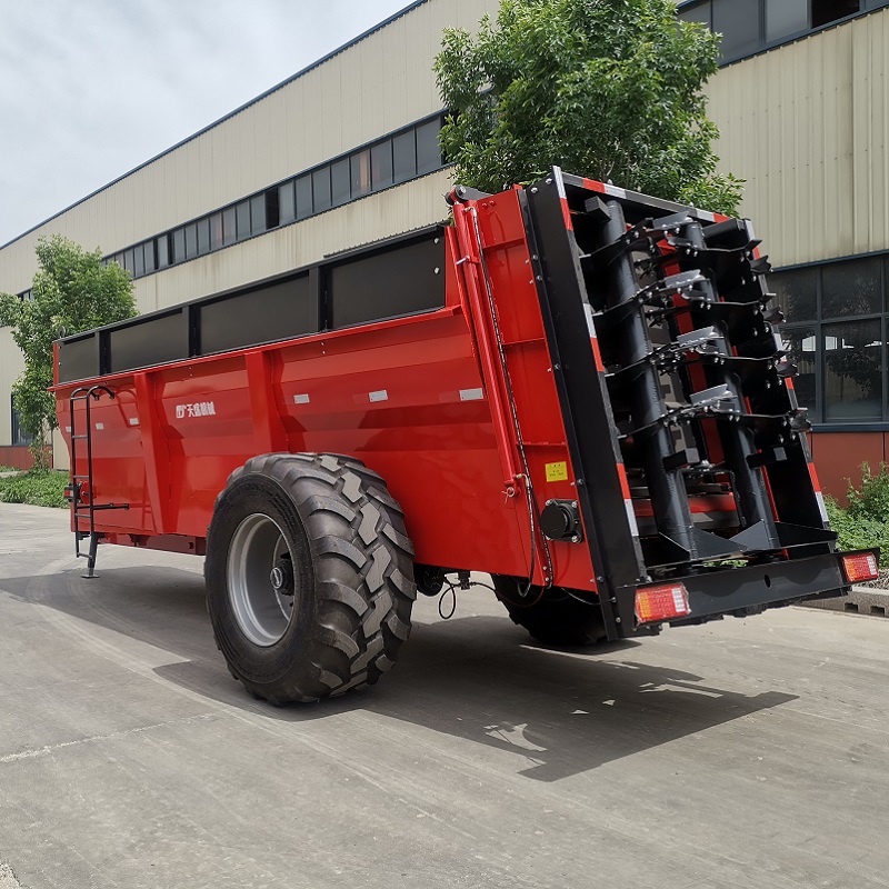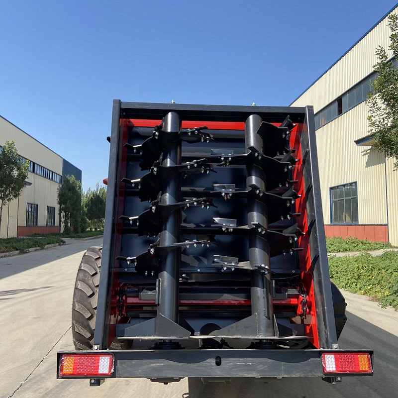 12立方雙豎螺旋絞龍式后拋撒肥機(jī),是一款120馬力以上拖拉機(jī)為動力,把水分不超過80%的禽畜糞便、污泥、商品有機(jī)肥、農(nóng)家肥、干糞等肥料進(jìn)行拋撒還田的新型撒肥機(jī)器。該機(jī)肥料輸送結(jié)構(gòu),是由拖拉機(jī)后輸出驅(qū)動液壓馬達(dá)工作,通過送肥裝置把整箱肥料均衡的運(yùn)送到出肥口;雙絞龍由拖拉機(jī)動力輸出軸驅(qū)動,通過三聯(lián)體齒輪箱驅(qū)動絞龍旋轉(zhuǎn)攪碎肥料,同時(shí)把糞肥均勻的拋撒出去。